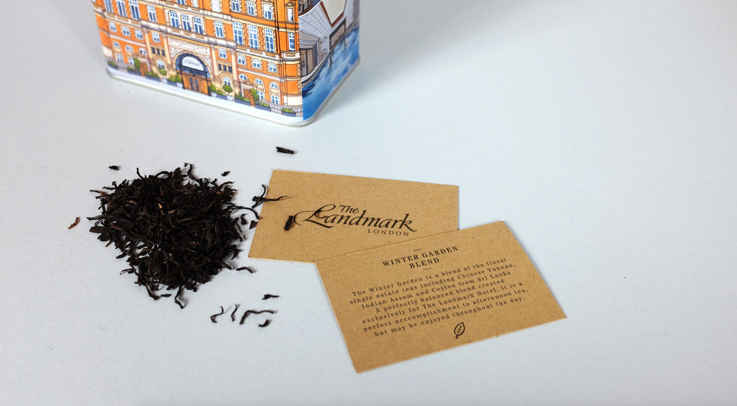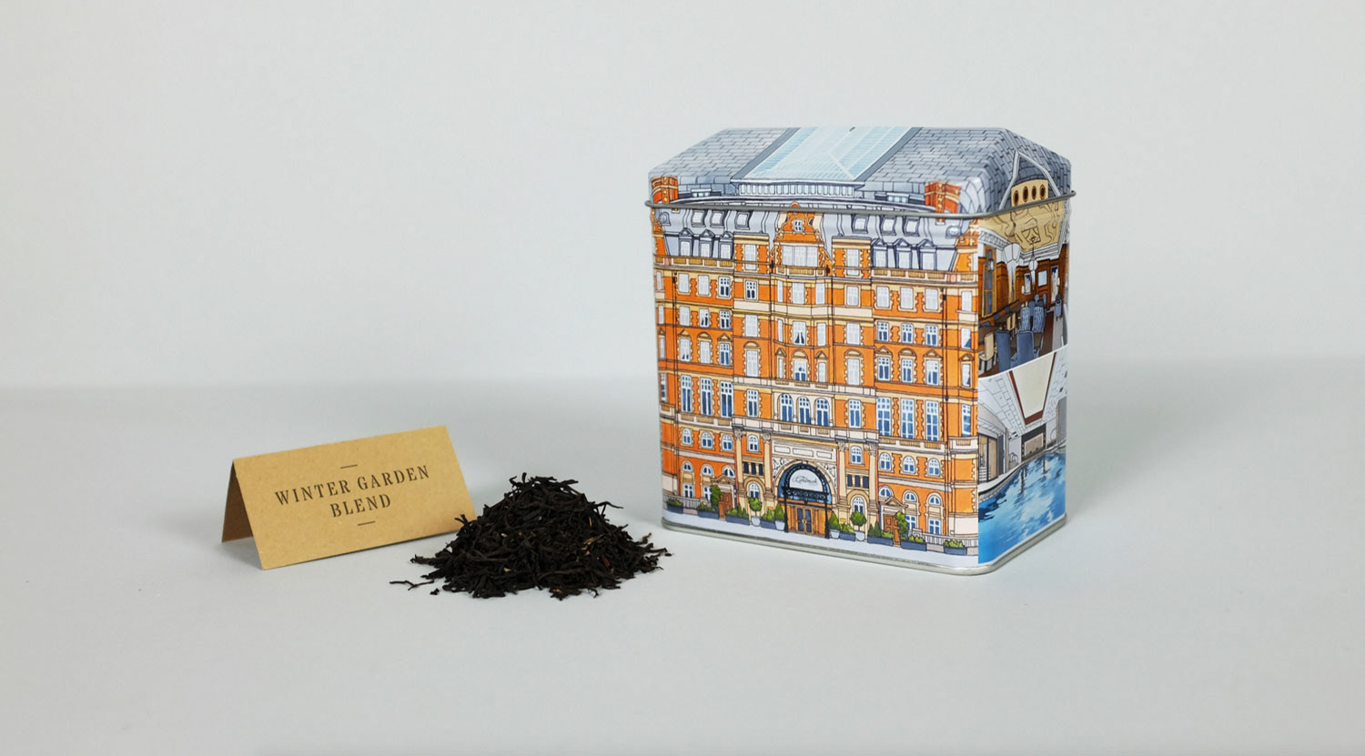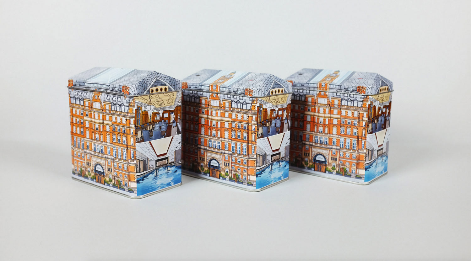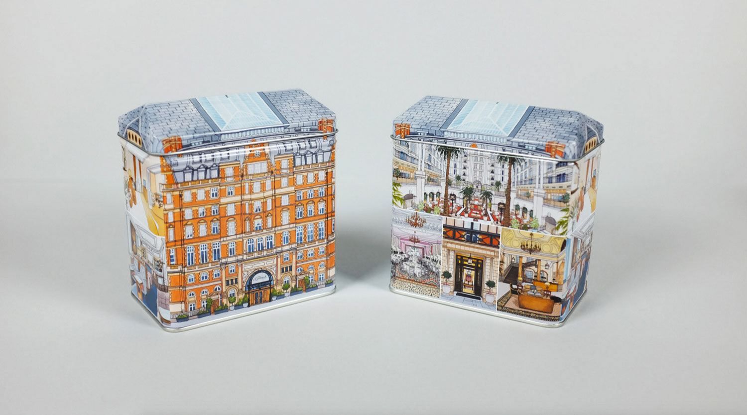 Illustrations created for the Landmark London. Images feature the exterior details as well as several interiors distinctive to the hotel. Reproduced onto a tin tea caddy for their 'Winter Garden Blend'.
