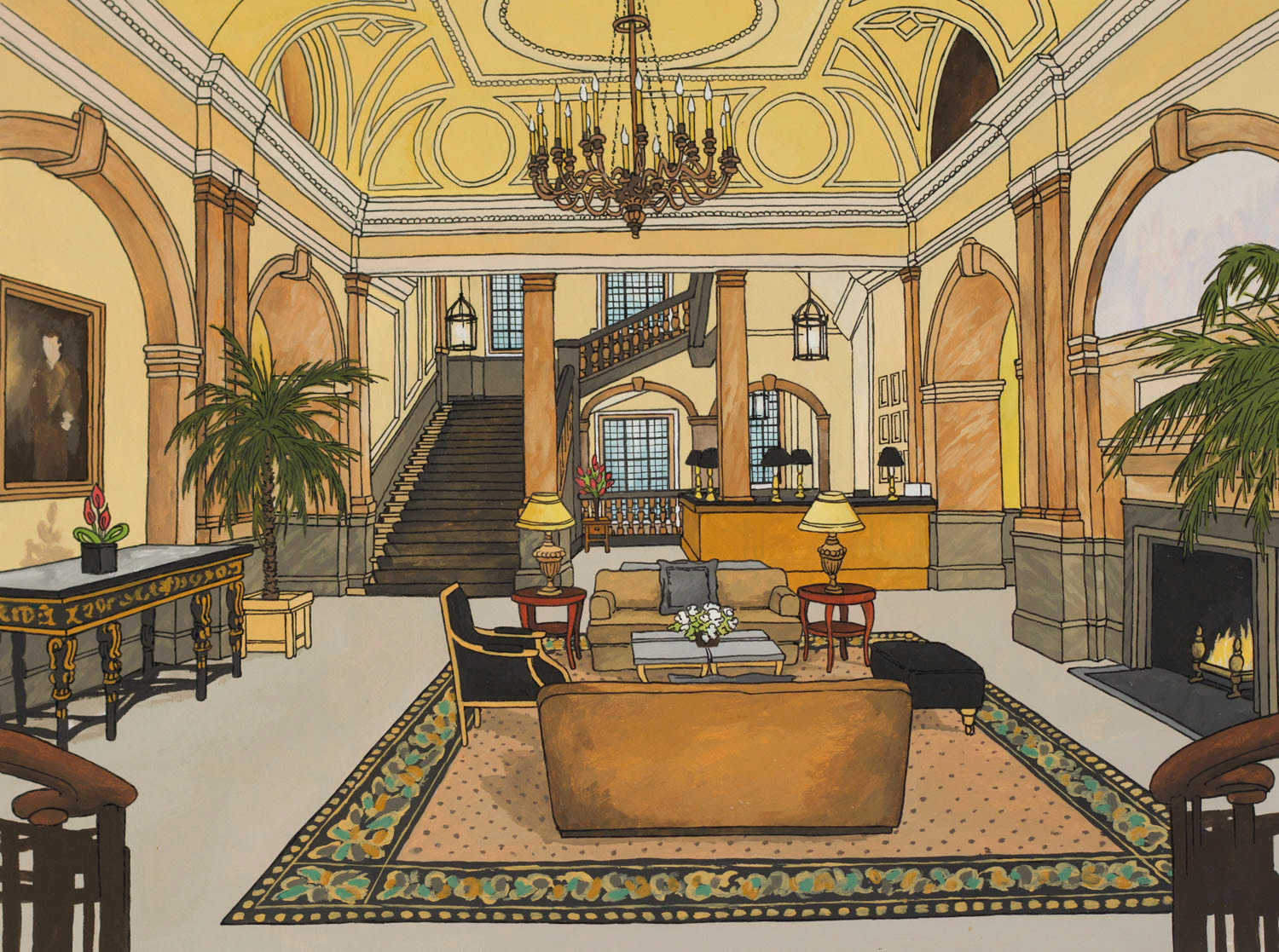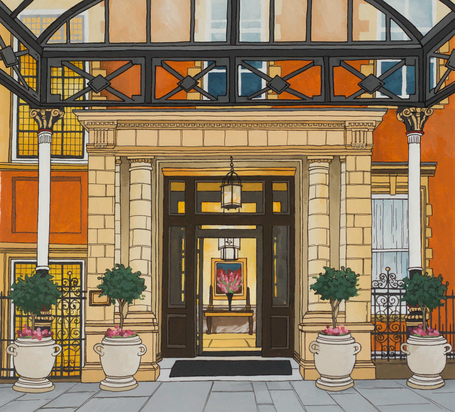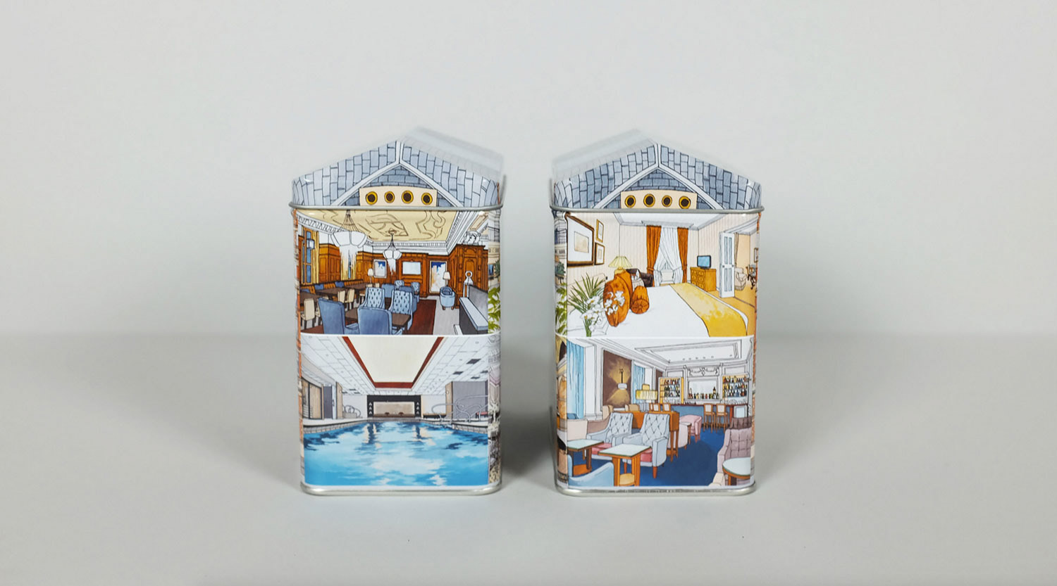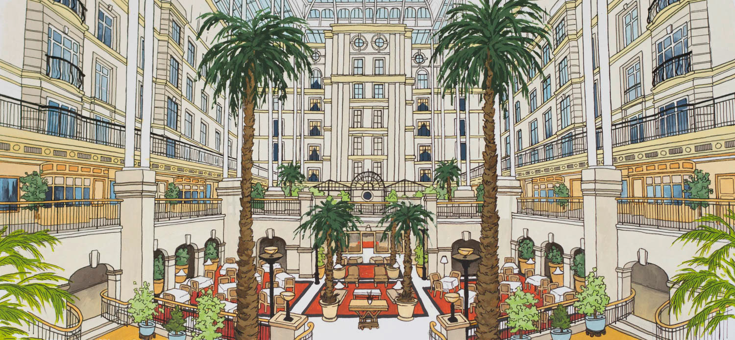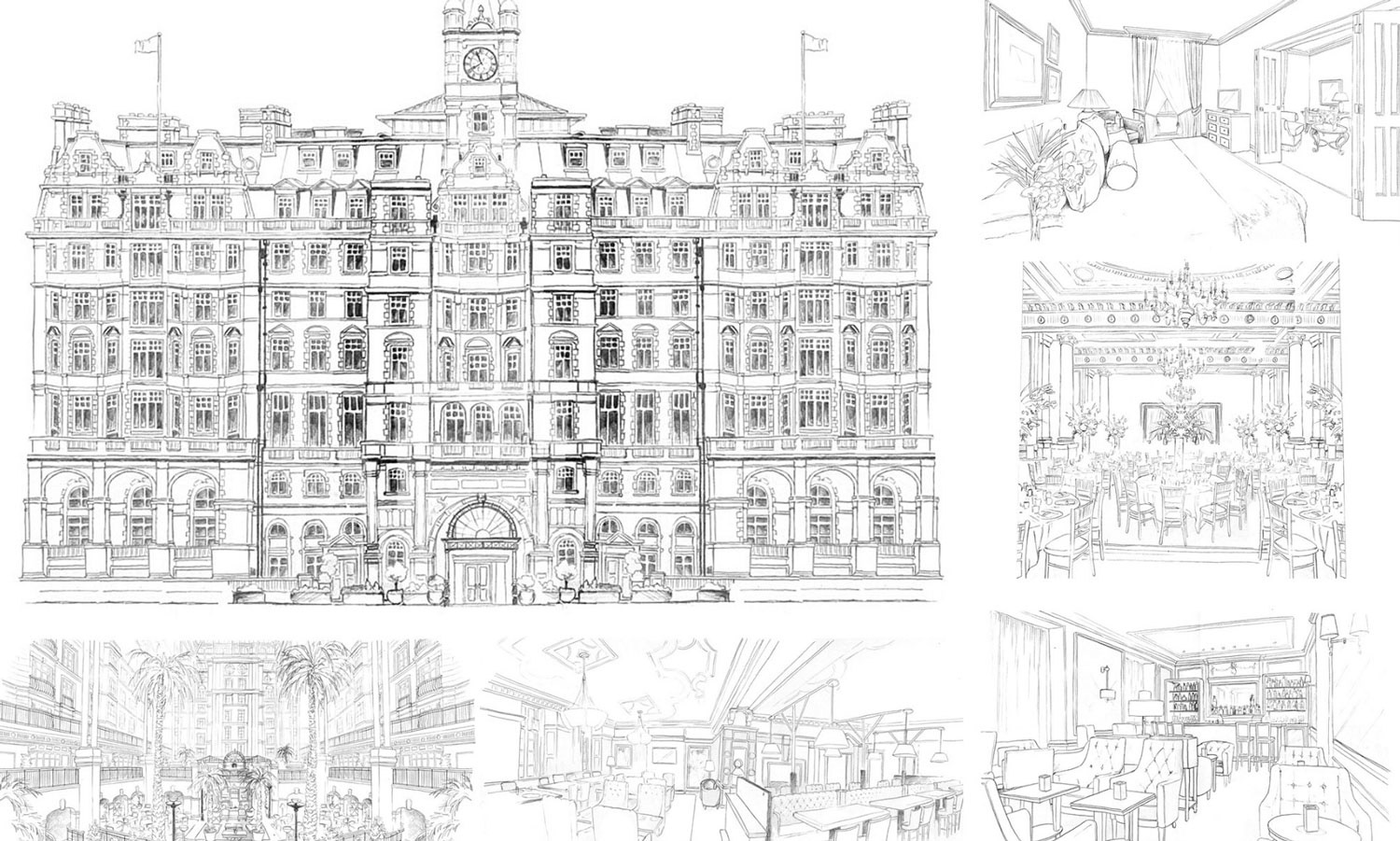 Illustrations created for the Landmark London. Images feature the exterior details as well as several interiors distinctive to the hotel. Reproduced onto a tin tea caddy for their 'Winter Garden Blend'.