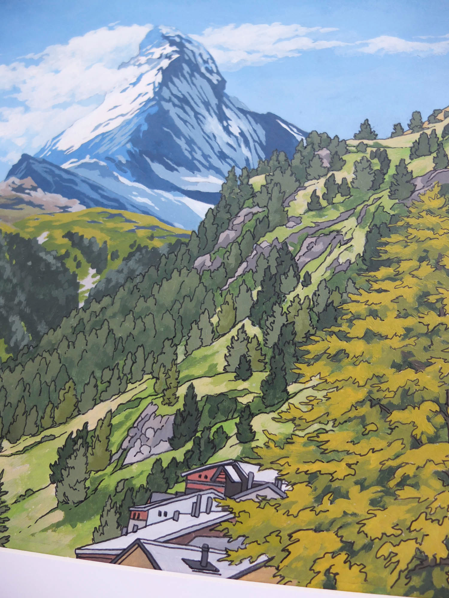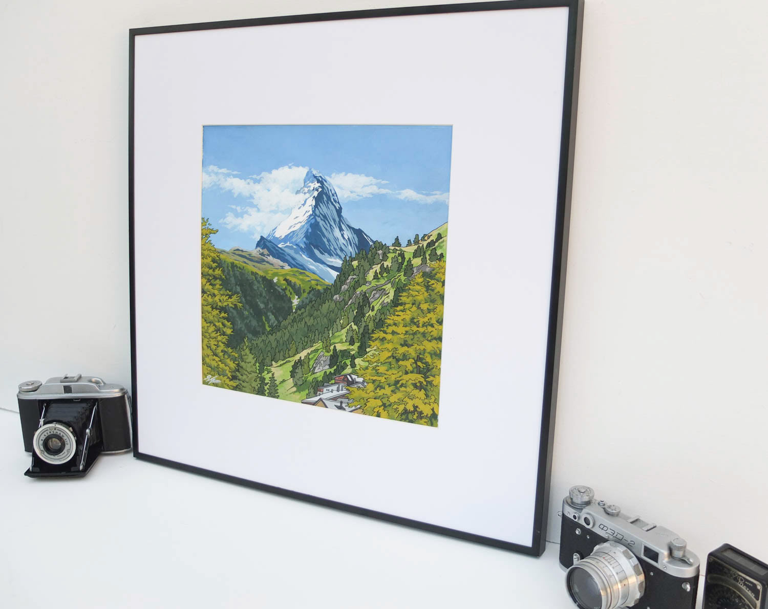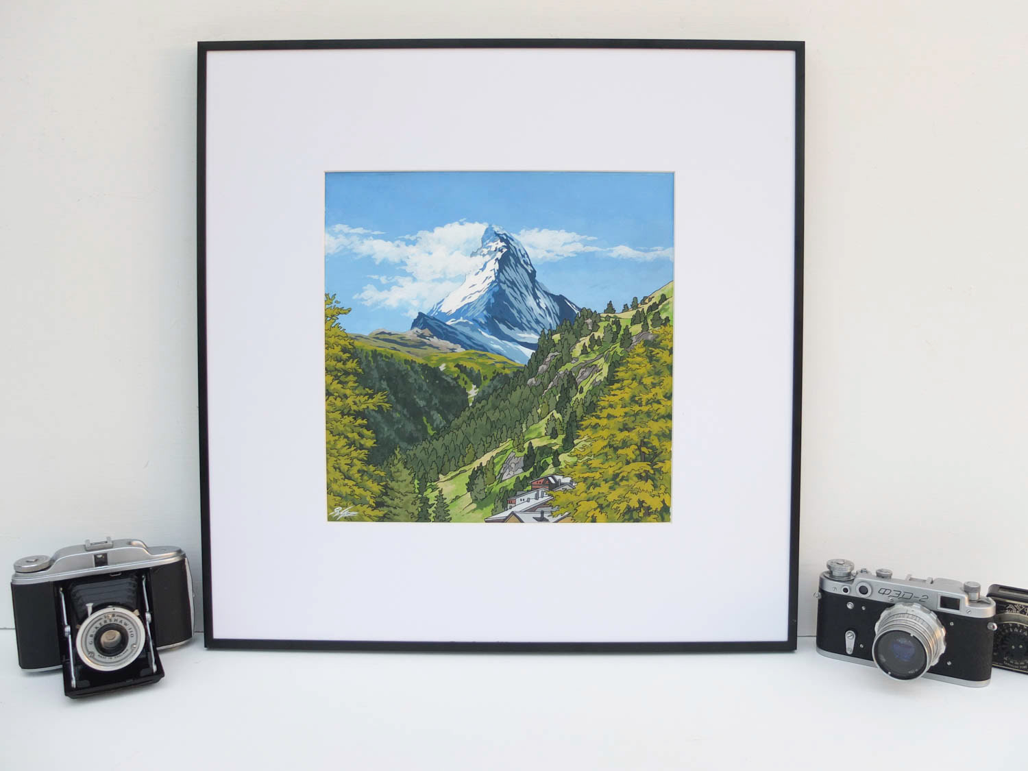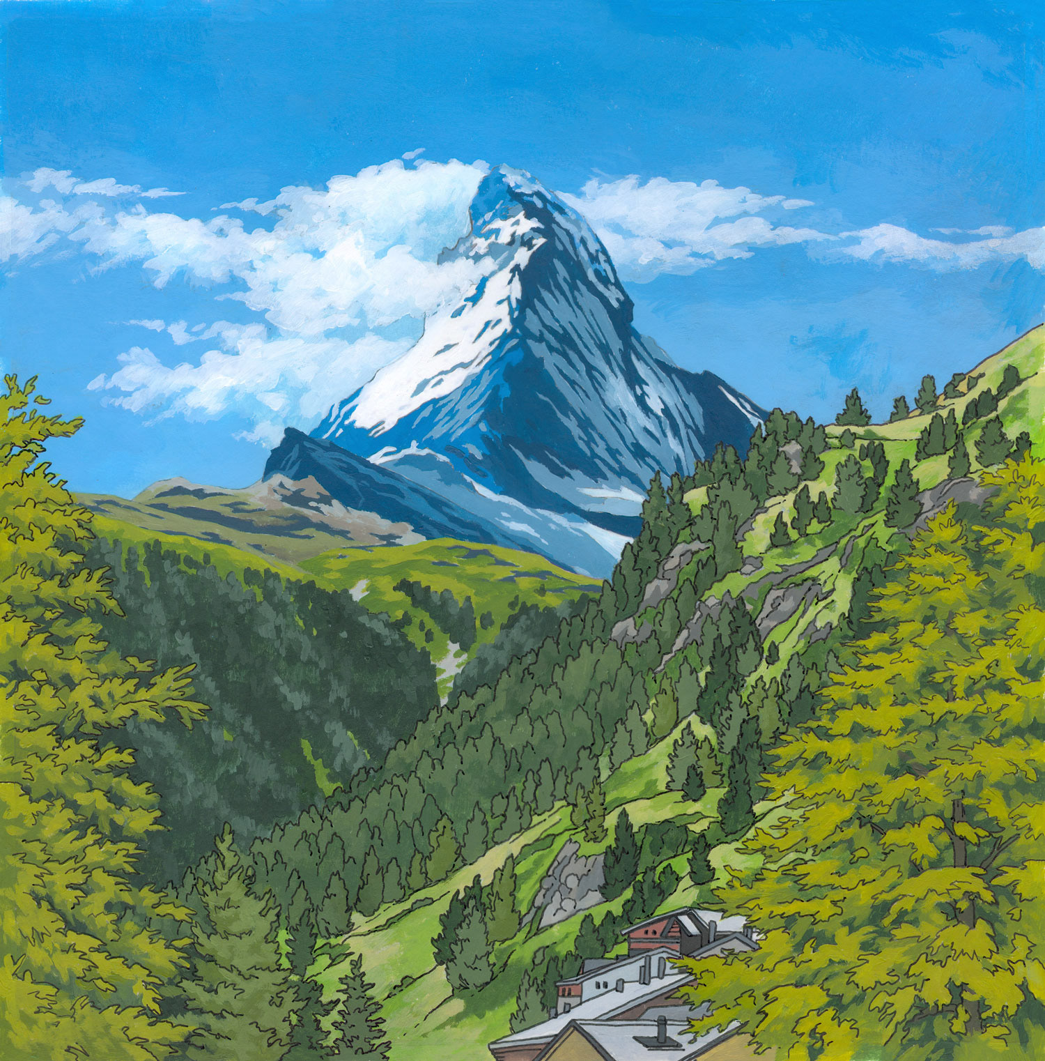 Summertime view of the Matterhorn in Switzerland, 29 x 29 cm, hand painted with acrylic and ink on paper.