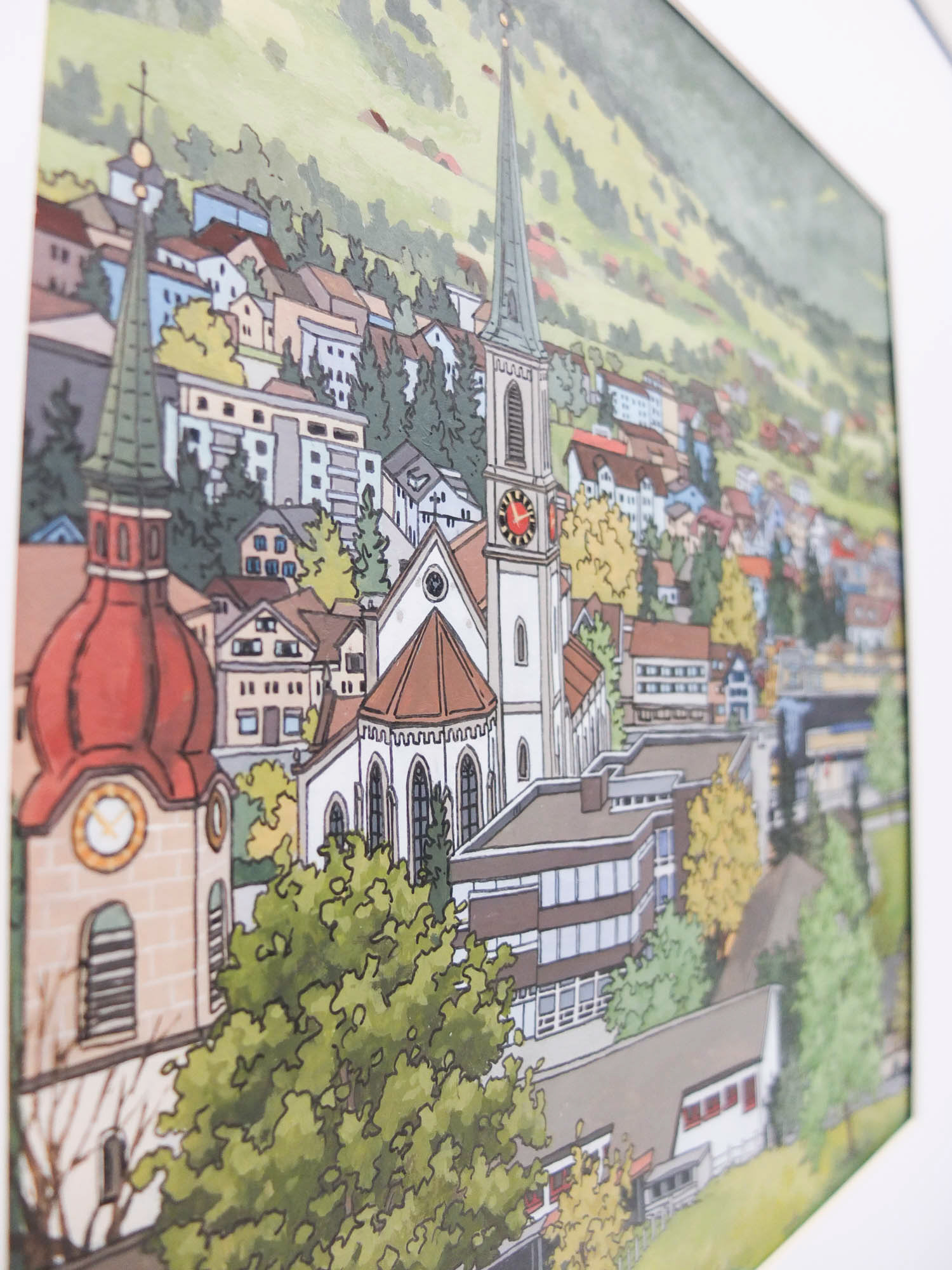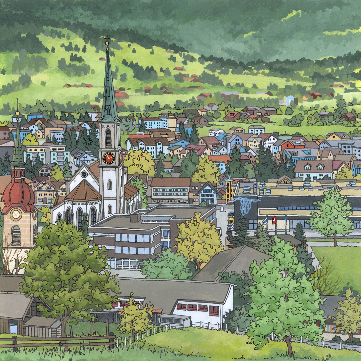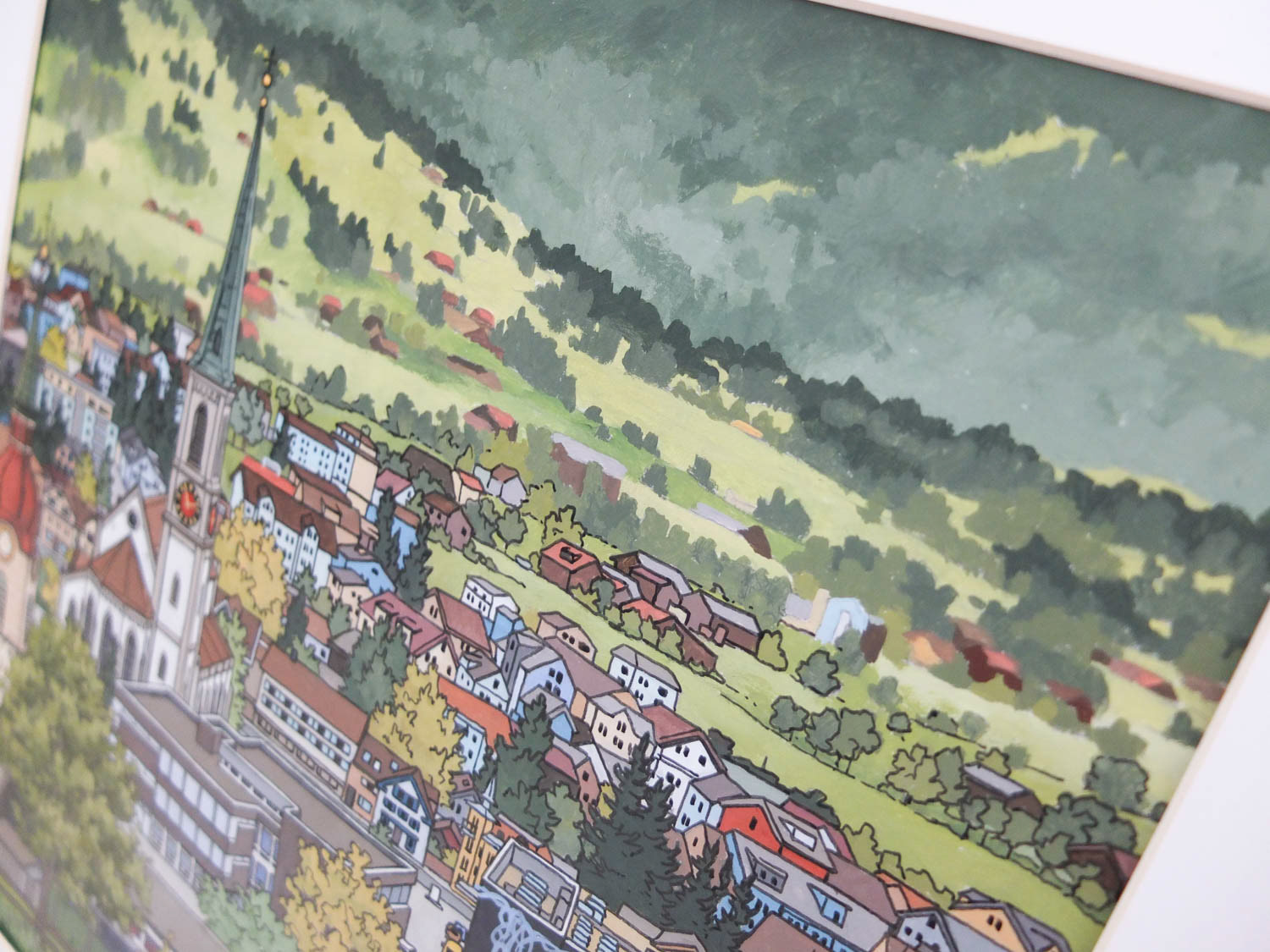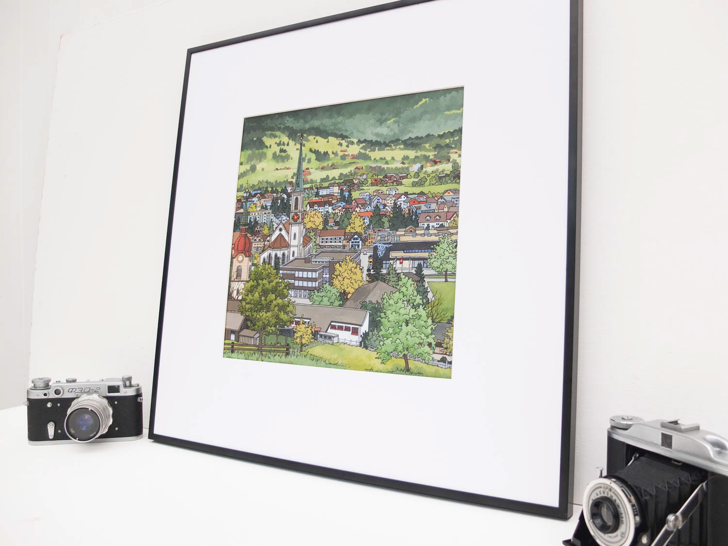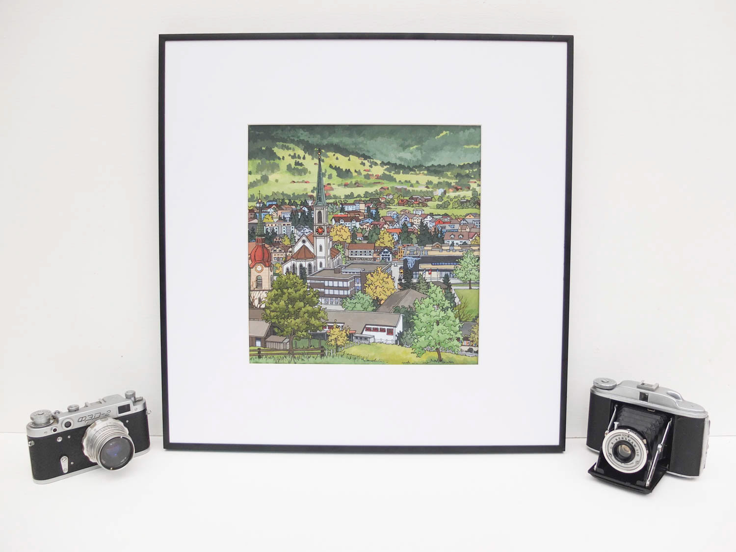 View over the town of Unterägeri in Switzerland, 29 x 29 cm, hand painted with acrylic and ink on paper.